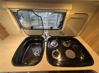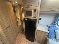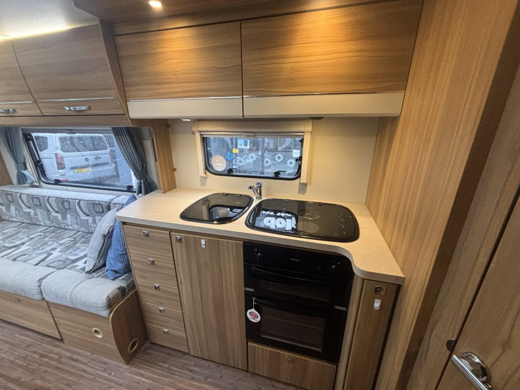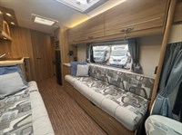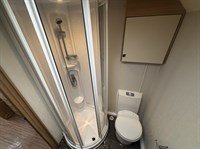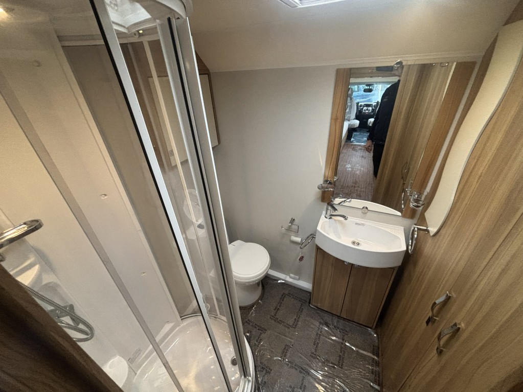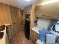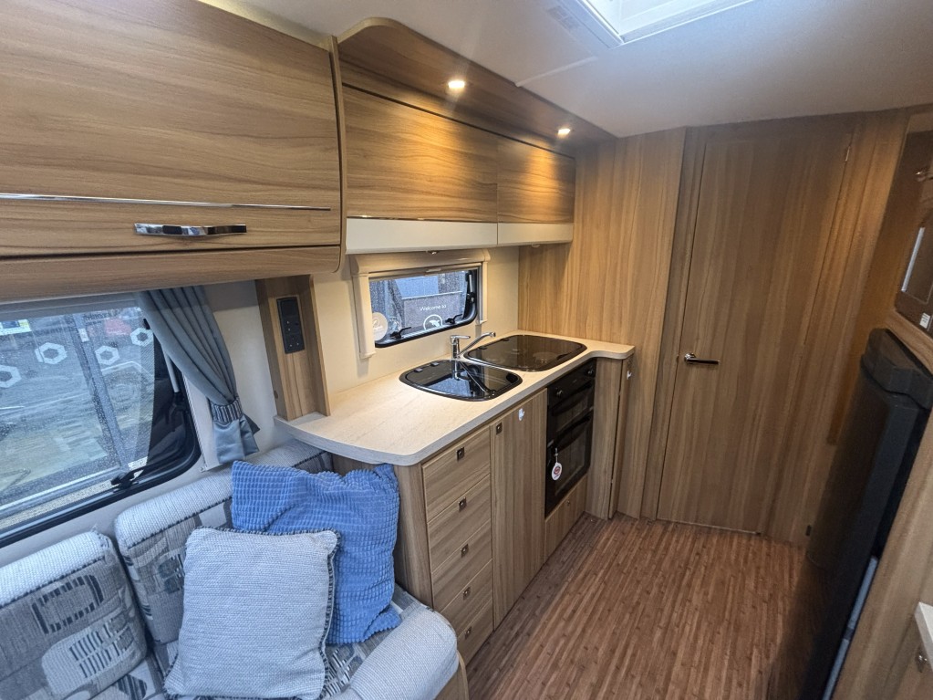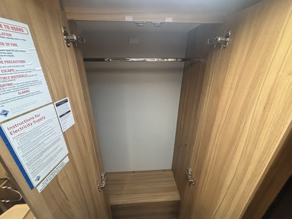 Inside, you’ll find a well-equipped galley kitchen with gas hob, grill, oven and microwave, plus a large fridge and ample storage. At the rear, a generously sized bathroom incorporates a separate shower cubicle, vanity area and wardrobe space — a standout feature in this class.