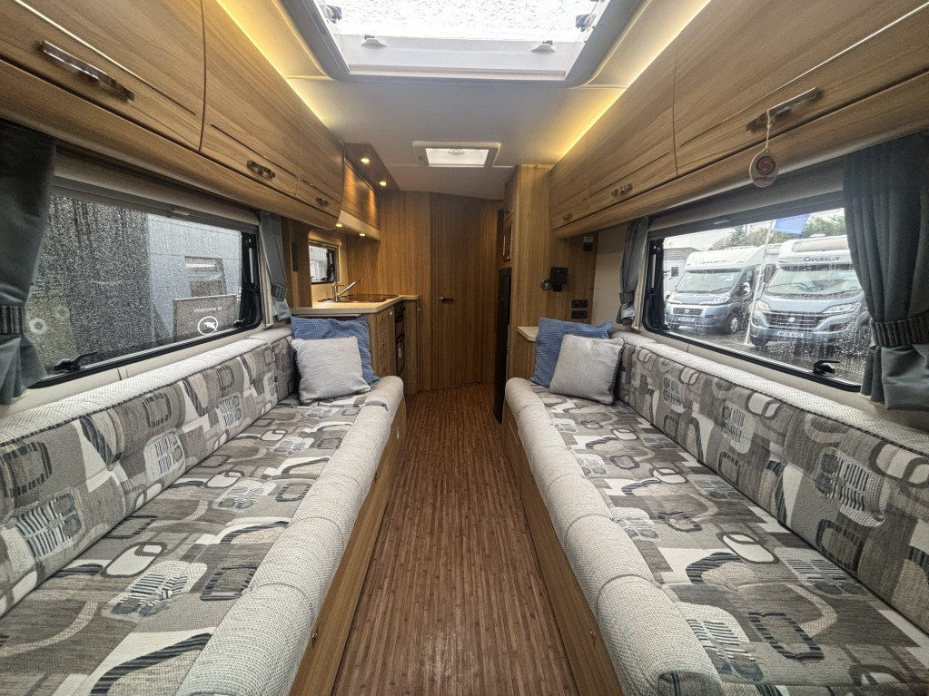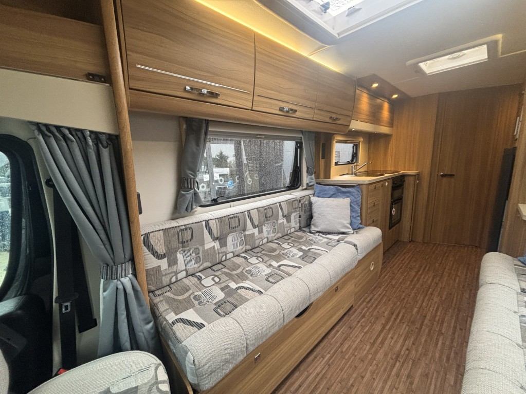 Built on a reliable Peugeot Boxer 2.2 HDi diesel chassis with a 6-speed manual gearbox, this motorhome delivers a smooth drive and can be driven on a standard licence thanks to its 3,500 kg MTPLM. The spacious front lounge features long bench seating that easily converts into a large double bed or two singles — perfect for relaxing by day and sleeping soundly at night.
