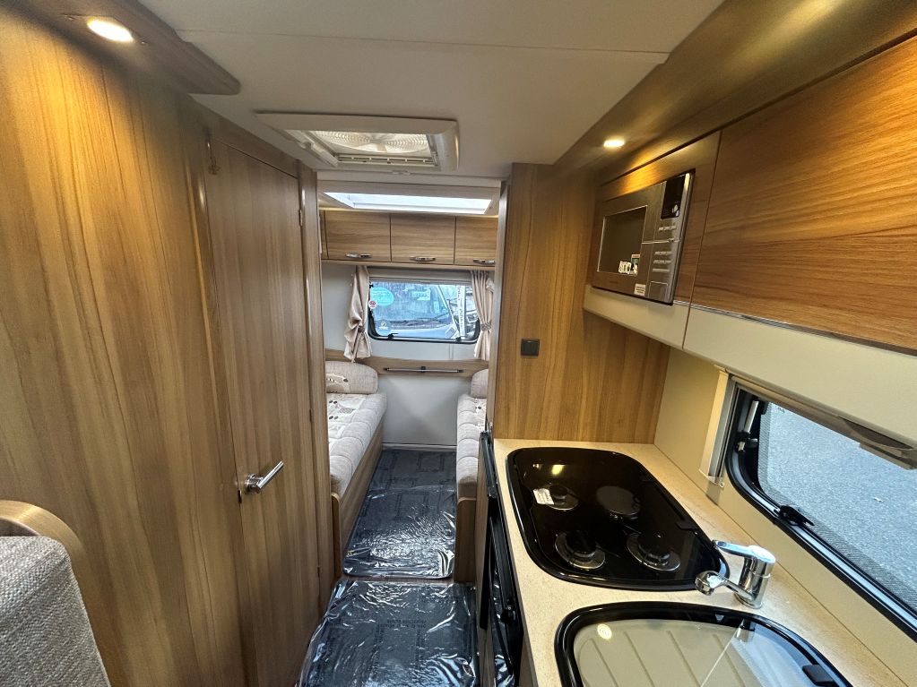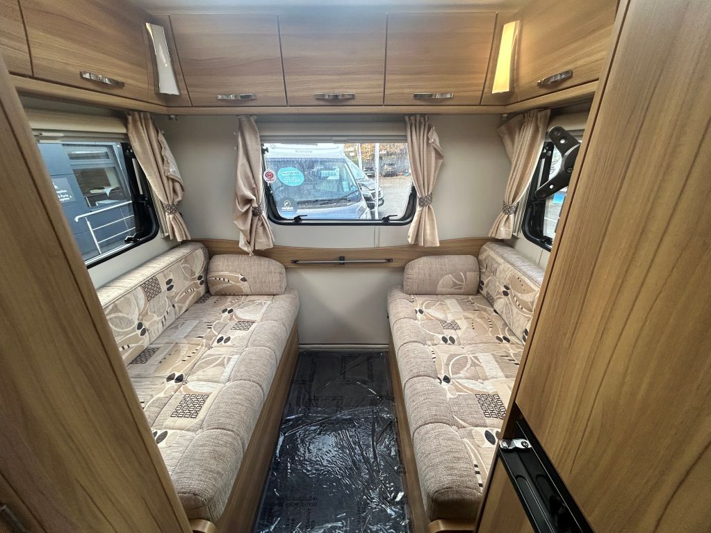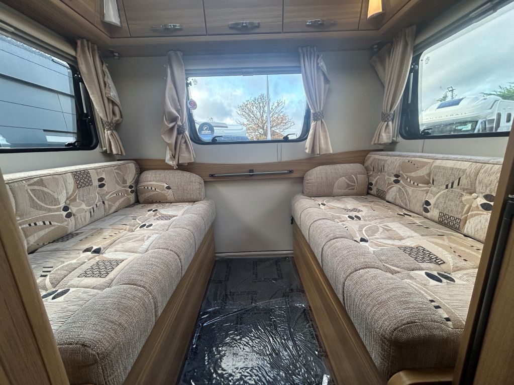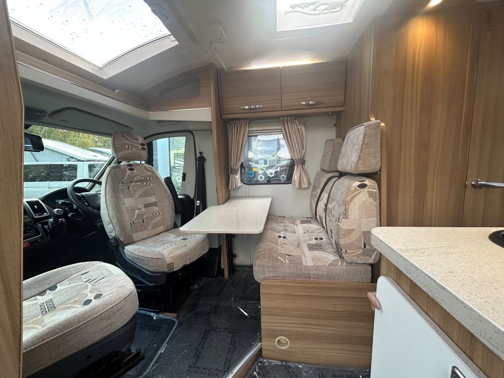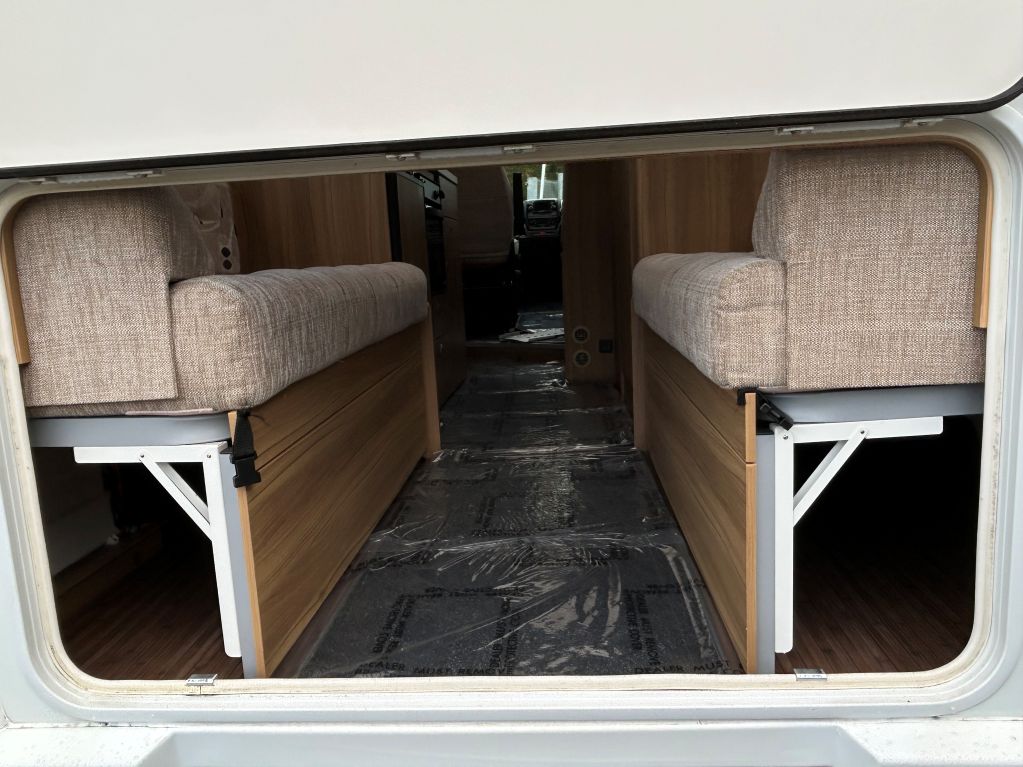- Rear lounge: Twin settees that form a large transverse double bed (~2?m × 1.23?m); a table and swivel cab seats add dining flexibility.