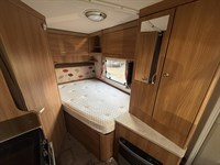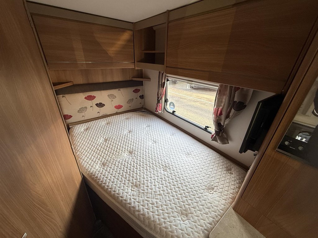 - 2-berth, 2-belts configuration with a fixed rear French double bed (~1.90×1.40m) featuring under-bed storage accessible from inside and via outside locker.