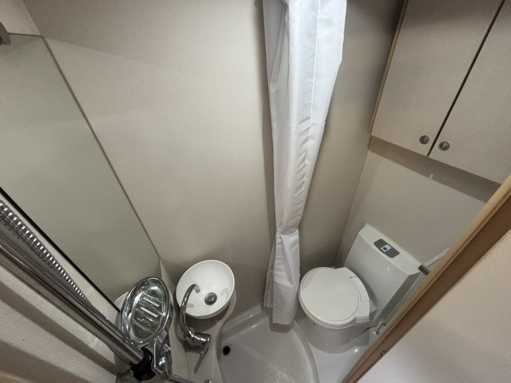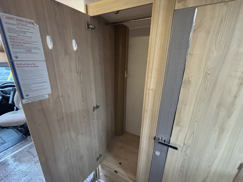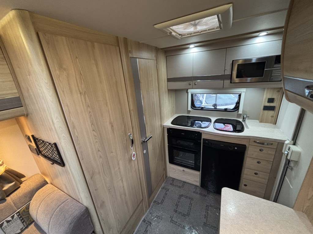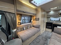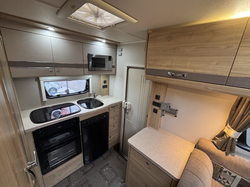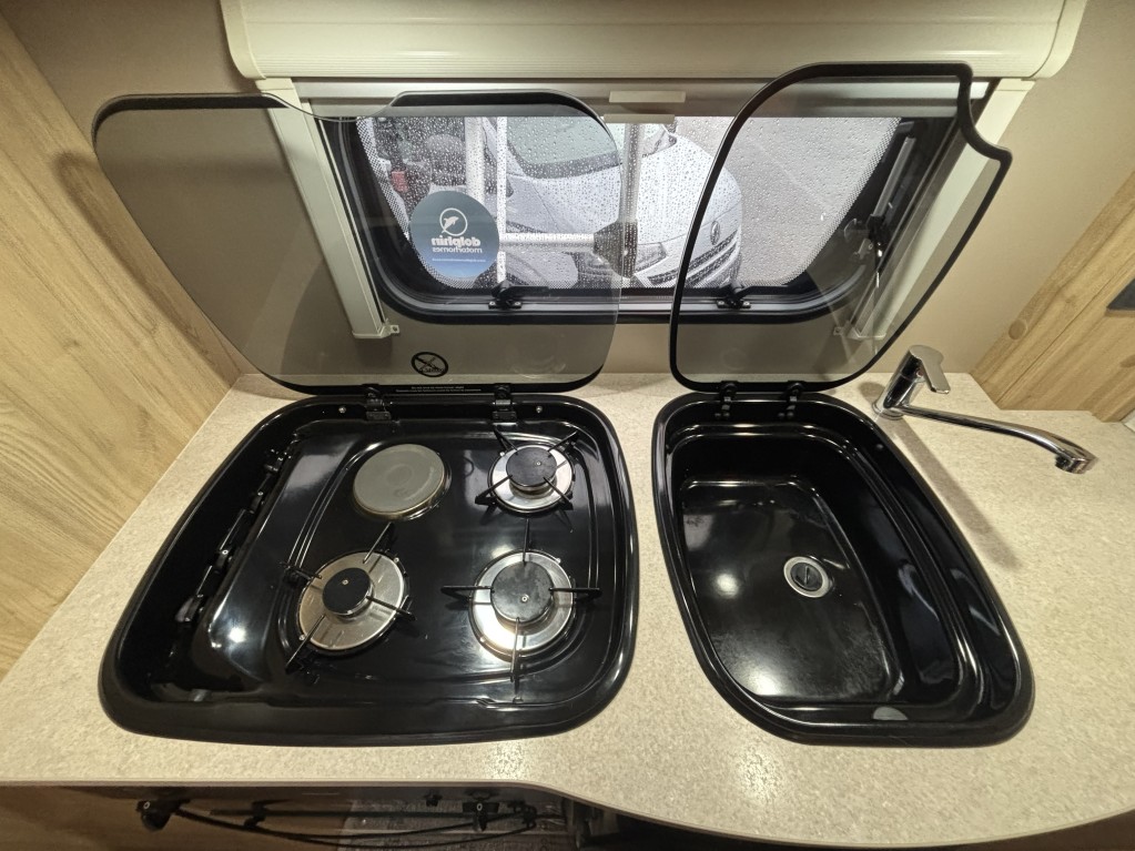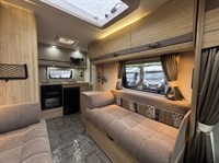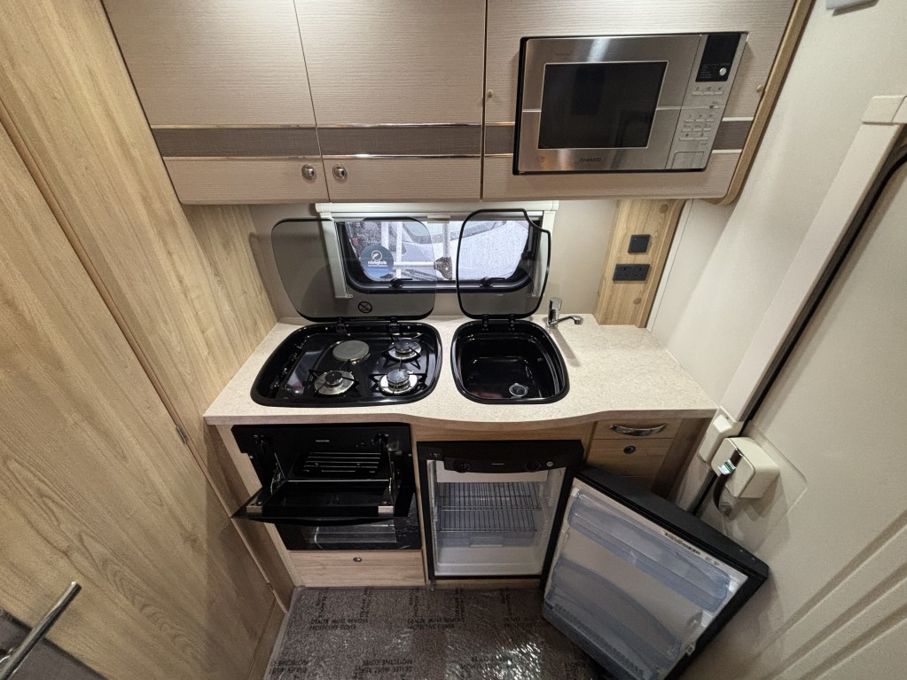 Inside, the front lounge area easily converts into a comfortable double bed, making the most of the space for relaxing by day and sleeping by night. The end kitchen includes essential appliances such as a three-burner hob, grill/oven, microwave and fridge, giving you everything you need to cook on the go.